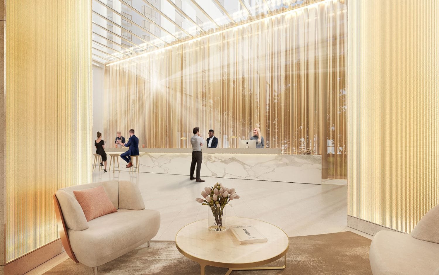Lumière, volume et raffinement… Le vaste lobby offre une expérience à la mesure du 50 Montaigne. Tout proche, le jardin d’hiver est le lieu de convivialité idéal pour dialoguer de manière informelle ou se détendre après un rendez-vous.